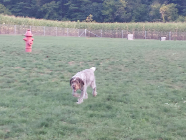 My mom and dad walked in the door around 5pm, which surprised me as I didn't think they would be home until at least 7. My mom was still restless from her busy day (selling T-shirts at the car show) and she wanted to know if I wanted to take Jerseydog to the dog park with her.
